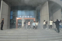 随后,警报响起,消防疏散演练正式开始。按照演练预案,消防疏散演练各工作组迅速就位,组织师生有序疏散。师生在疏散引导小组的指导下,弯腰并用手捂住口鼻,按照预定路线紧张有序地迅速撤离至安全区。